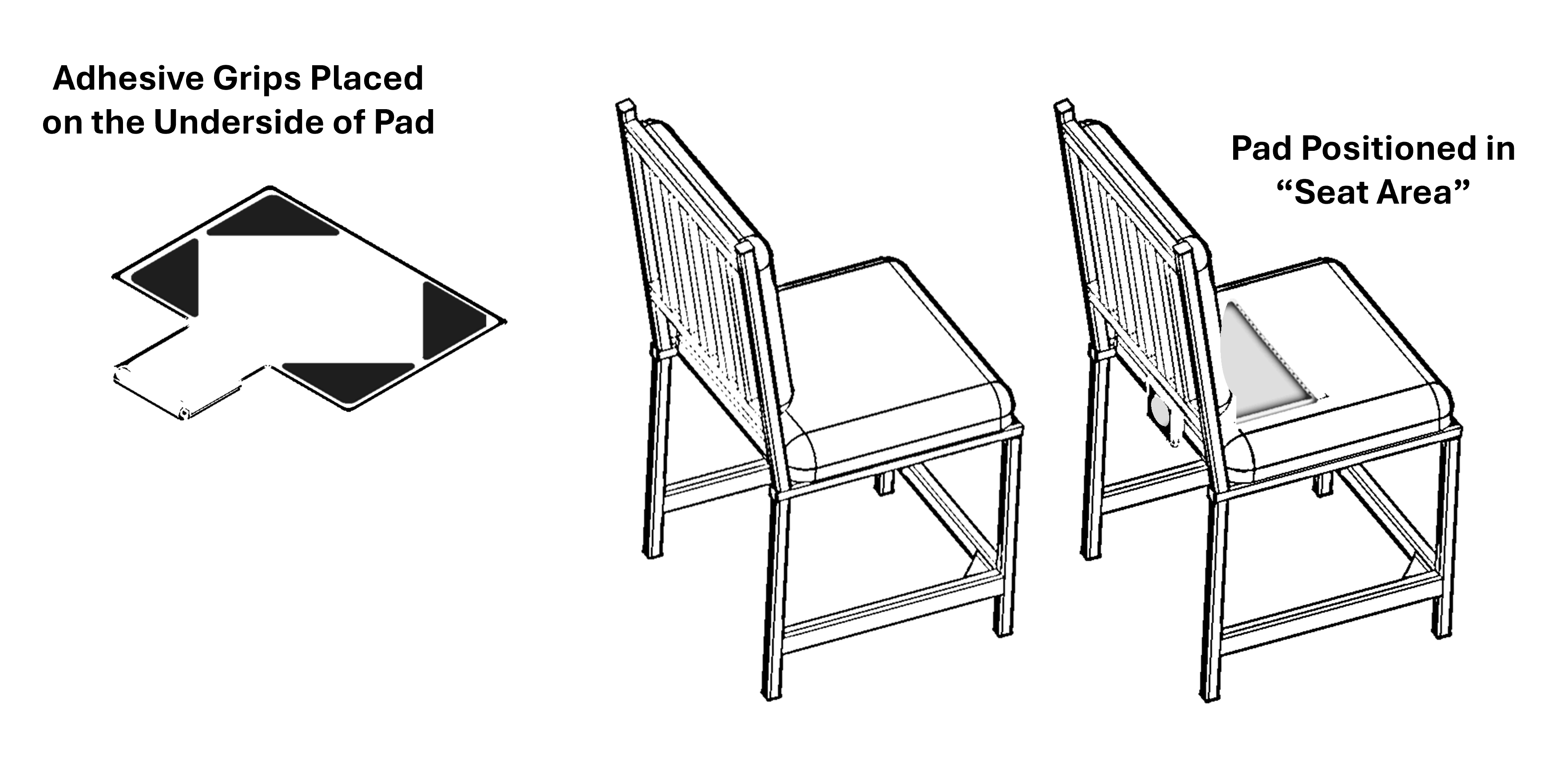 - Place sensor pad on the chair seat, with the printed text facing up.