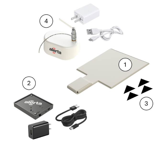 - Alerta Beacon (assembled in pad pouch) with USB Power Cable & Wall Adapter. Do not remove Beacon device from pouch.